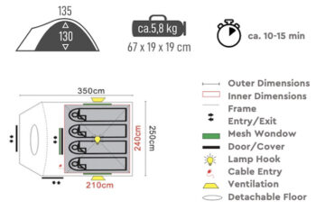 De LUCCA vìs-à-vìs familietent met stahoogte heeft twee aparte slaapcabines voor meer privacy. Het is mogelijk om de ruimte aan te passen door een slaapcabine te verwijderen. De tussenruimte heeft een beschermend grondzeil voor het droog opbergen van bagage. Ook zitten er twee deuren in deze tent wat de entree makkelijk maakt. Twee ventilatieopeningen en een raam met horrengaas zorgen voor een uitstekende luchtcirculatie, zodat het zelfs met meerdere mensen in de tent niet benauwd wordt. Het verwijderbare grondzeil van de leefruimte is makkelijk schoon te maken. Deze 4 persoons tent heeft een Black Coat binnen coating.
