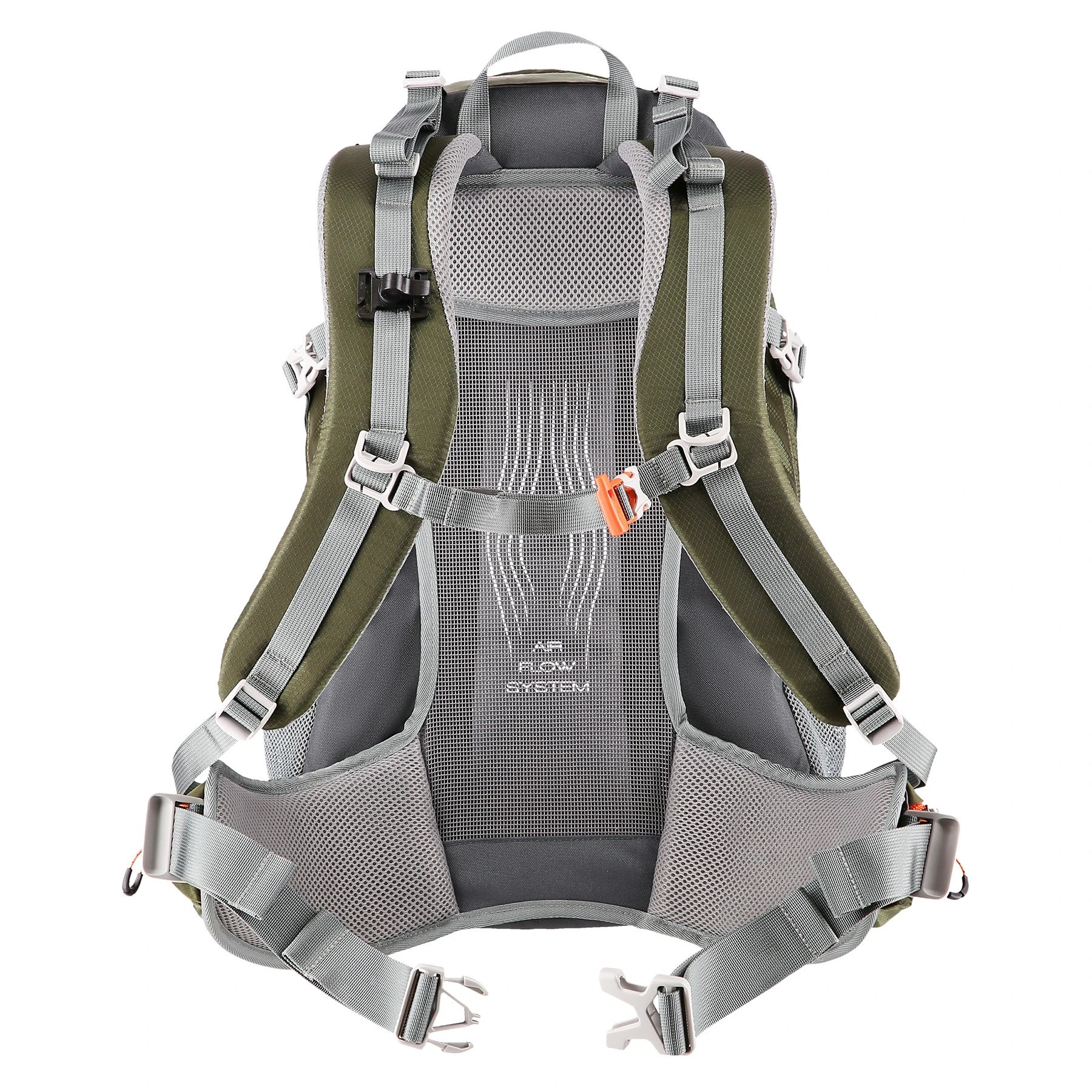 Ademend ventilatiepaneel -Een uniek ventilatiesysteem scheidt het hoofdvak van de achterkant en zorgt voor luchtcirculatie en comfort, zelfs bij het heetste weer. Bovendien rust het volledige gewicht van de rugzak op een voorgevormd frame dat de druk op de wervelkolom ontlast, waardoor het comfort tijdens lange bergtochten wordt verhoogd. Het paneel kan ook eenvoudig worden verwijderd, een handige optie wanneer je de rugzak wilt schoonmaken.