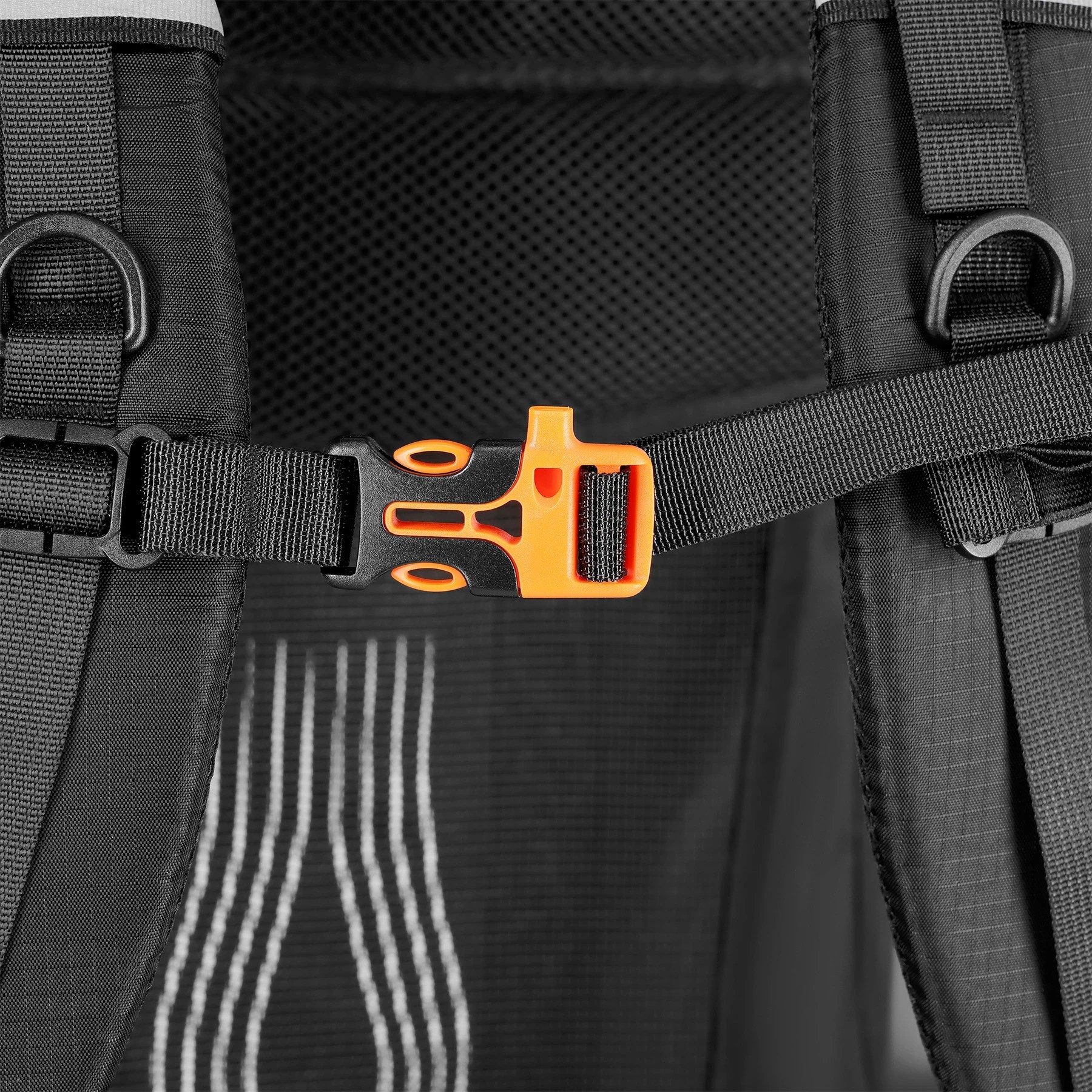 Ergonomie en comfort voor langdurig gebruik – Het ergonomische ontwerp van de rugzak, samen met de verstelbare banden, zorgt voor een perfecte pasvorm op het lichaam van de gebruiker, waardoor de wervelkolom minder wordt belast en het algehele draagcomfort wordt verhoogd. Het draagsysteem van de rugzak bestaat uit verstelbare banden met zachte vulling om het risico op schouderwrijving te verminderen. De banden zijn breed en voorgevormd om het gewicht gelijkmatig over de schouders te verdelen, wat het comfort aanzienlijk verhoogt, vooral tijdens lange en veeleisende expedities. De rugzak is ook uitgerust met tal van punten waaraan je extra uitrusting kunt bevestigen, zoals wandelstokken of een slaapzak, waardoor hij nog functioneler wordt.